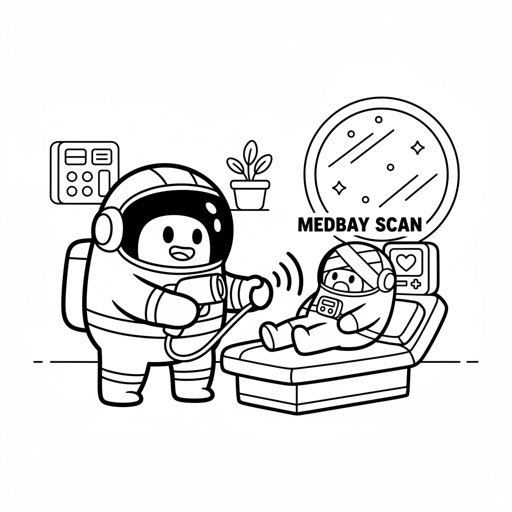Eine originale KI-generierte Fan-Art-Malvorlage, inspiriert von unter uns, mit einem bohnenförmigen Astronauten, der medizinische Aufgaben in der Krankenstation durchführt. Dies ist inoffiziell Fan-Kunst, nicht mit den ursprünglichen Schöpfer verbunden. Perfekt für Kinder und Erwachsene, die Färbung lieben!