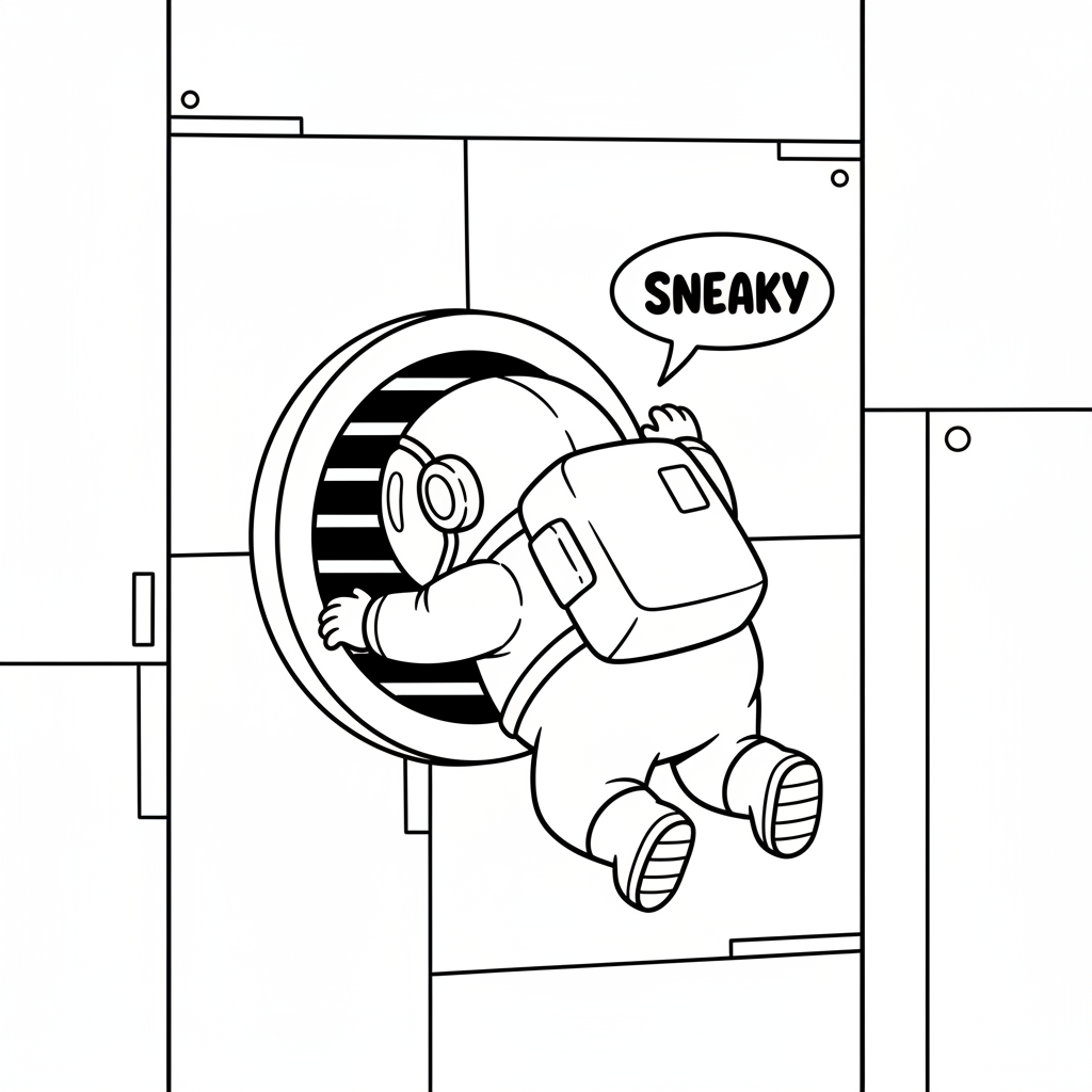Eine originale KI-generierte Fan-Art-Malvorlage, inspiriert von unter uns, die einen bohnenförmigen Astronauten zeigt, der heimlich in einen Lüftungsschacht eindringt. Dies ist inoffiziell Fan-Kunst, nicht mit den ursprünglichen Schöpfer verbunden. Perfekt für Kinder und Erwachsene, die Färbung lieben!