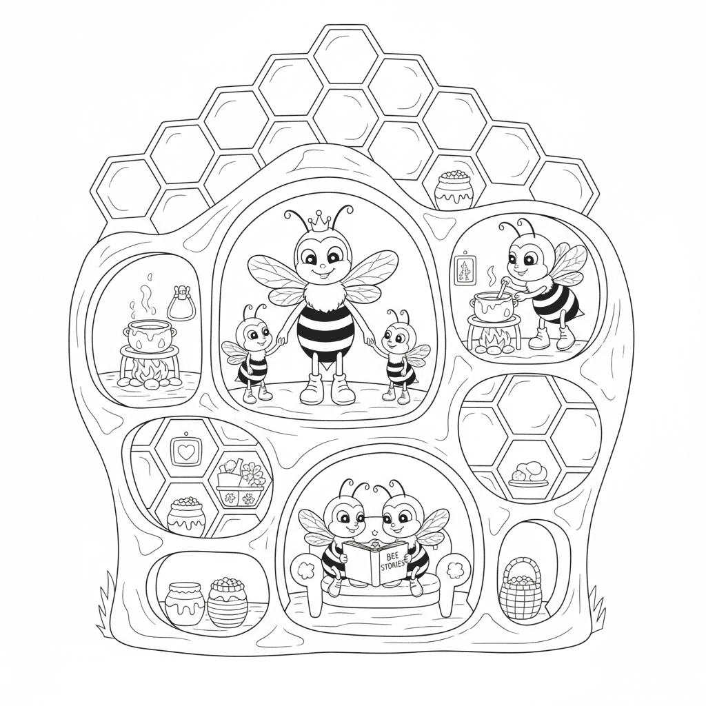 Schöne Bienenfamilie in Wabe nach Hause Färbung Seite für Kinder und Erwachsene. Kostenlos zum Herunterladen und Ausdrucken.