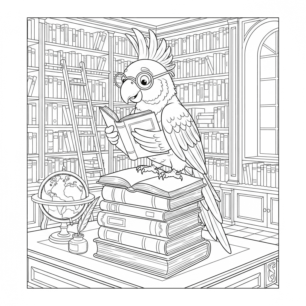 Ein Papagei liest ein Buch in einer Bibliothek