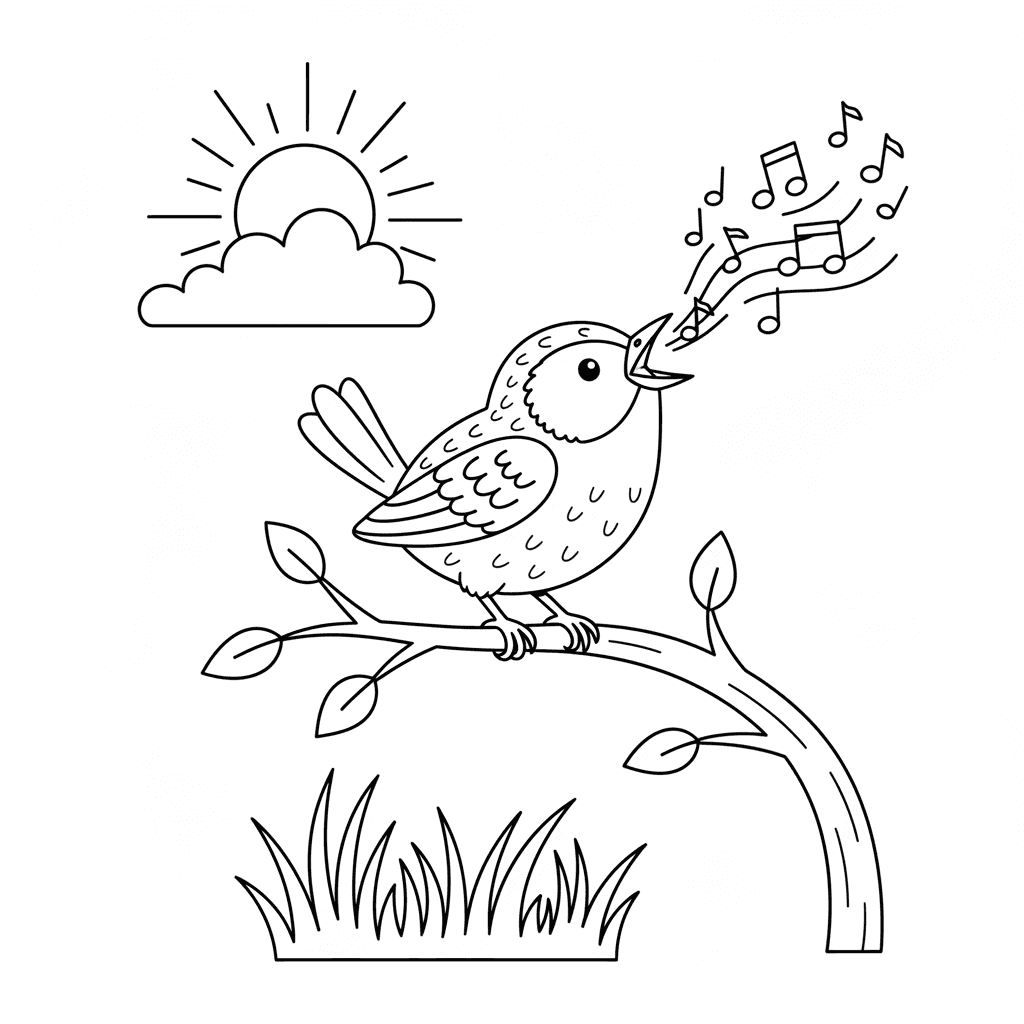 Eine reizvolle Vogel Malvorlage mit Zaunkönig singt Morgenlied laut. Perfekt für Kinder und Erwachsene, die Färbung lieben!
