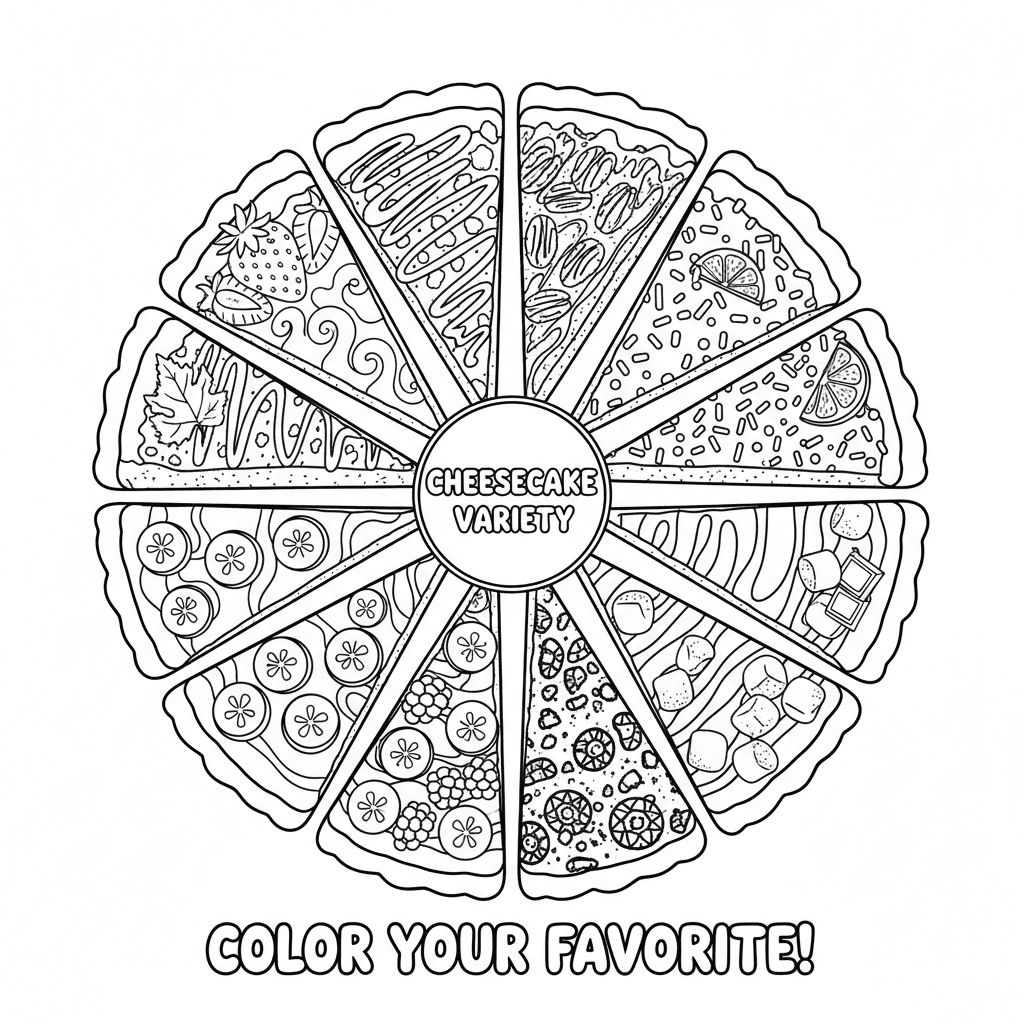 Ein köstlicher Kuchen Färbung Seite mit Käsekuchen Fabrik Stil Vielfalt Aromen. Perfekt für Kinder und Erwachsene, die das Ausmalen lieben!