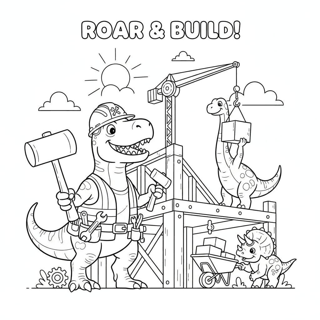Eine entzückende Dinosaurier-Malvorlage mit Dinosaurier Bauarbeiter Gebäude. Perfekt für Kinder und Erwachsene, die Färbung lieben!