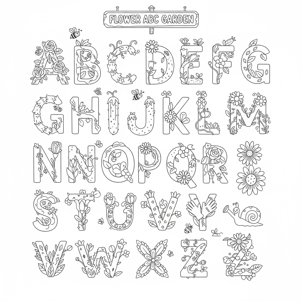 Eine reizvolle Blume Färbung Seite mit Blume Alphabet Brief Garten kreativ. Perfekt für Kinder und Erwachsene, die Färbung lieben!