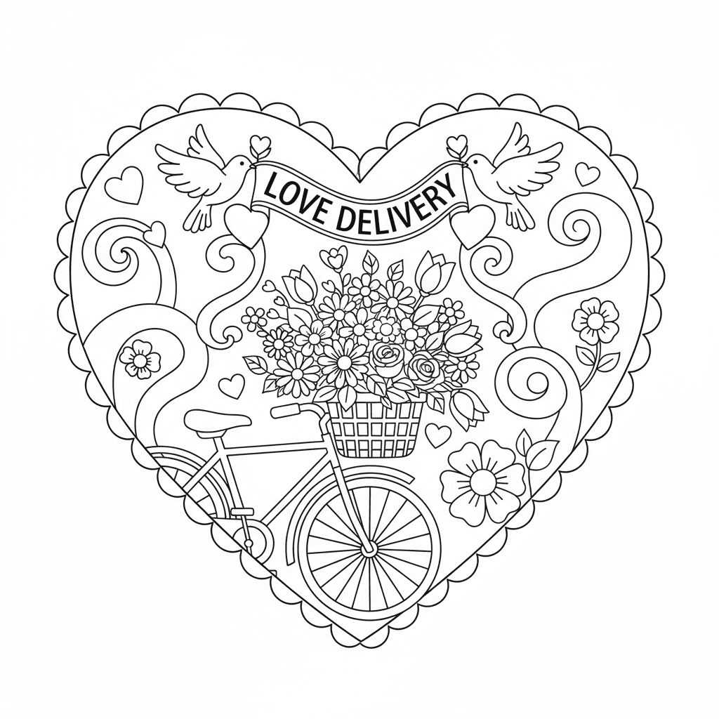 Eine reizvolle Blume Färbung Seite mit Blumenkorb Fahrrad Lieferung romantisch. Perfekt für Kinder und Erwachsene, die Färbung lieben!