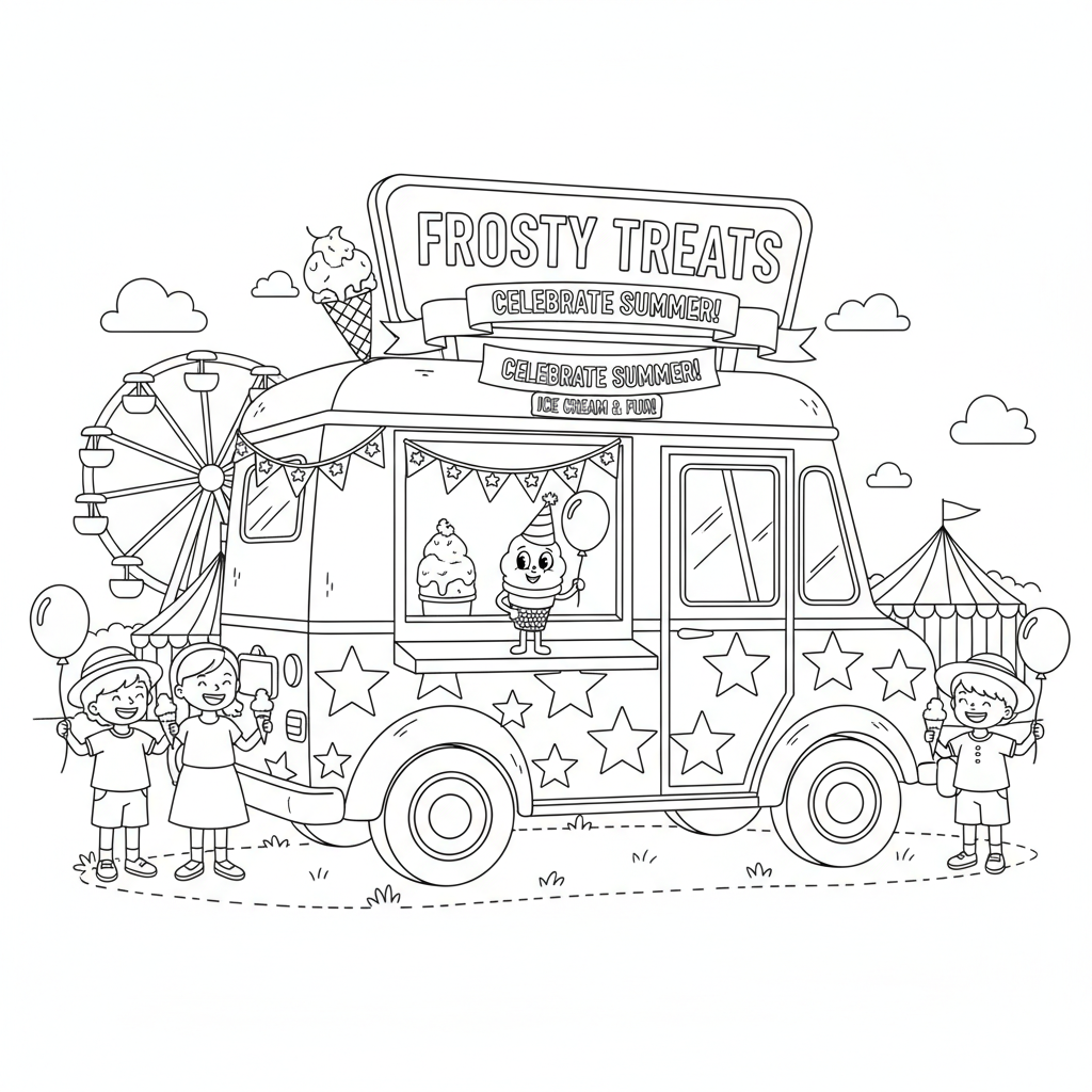 Eine wunderschöne Ausmalseite zum Unabhängigkeitstag mit einem Eiswagen, der festlich geschmückt ist und auf einem Sommerfest patriotische Dekorationen trägt. Perfekt für Kinder und Erwachsene, die gerne ausmalen!