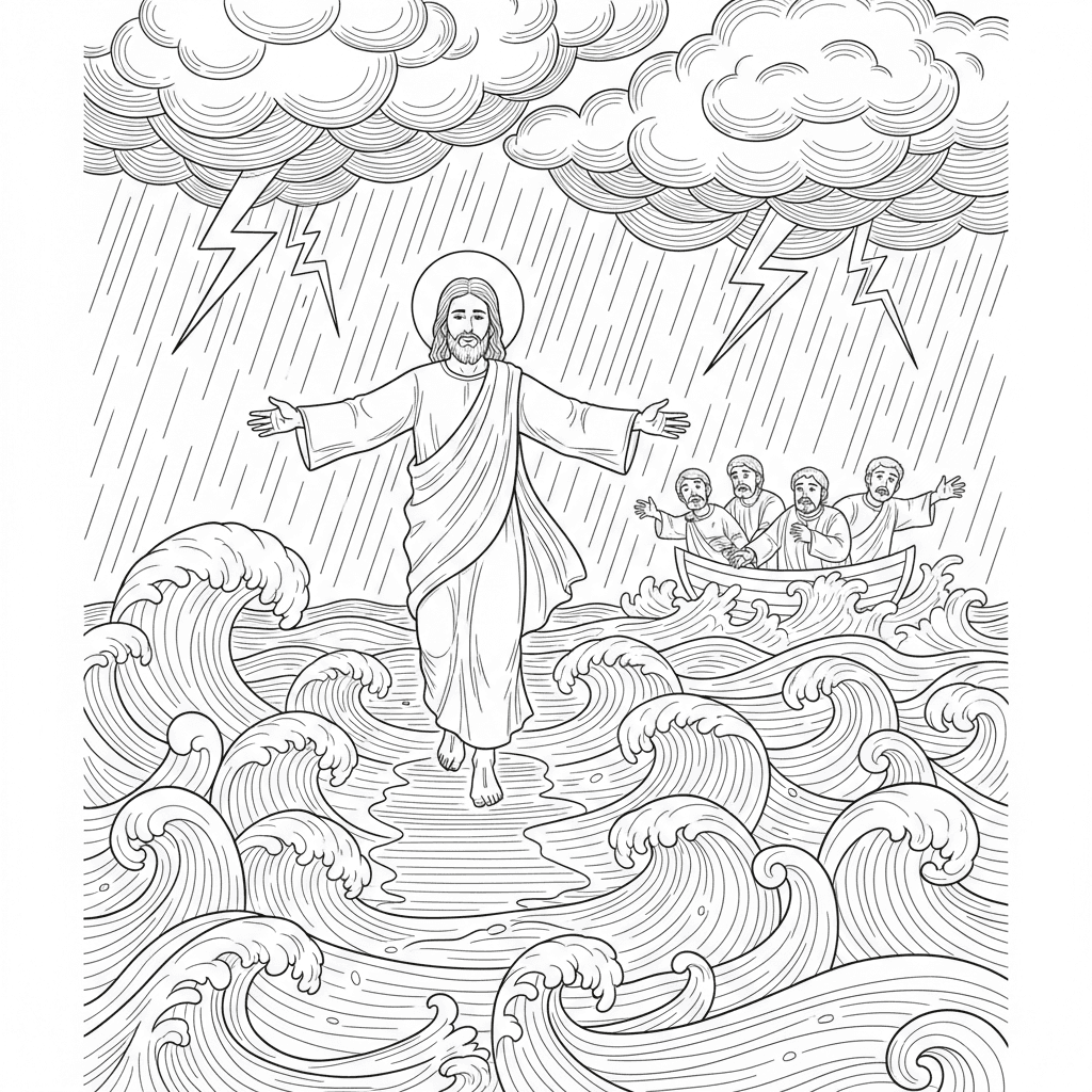 Jesus geht während eines Sturms über das Wasser.