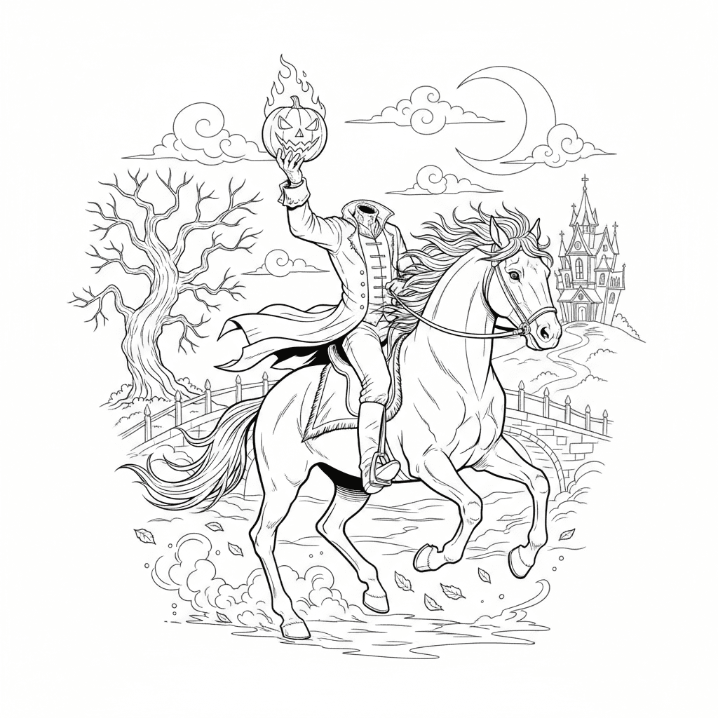 Schöne kopflose Reiter reiten Pferd Malvorlage für Kinder und Erwachsene. Kostenlos zum Herunterladen und Ausdrucken.