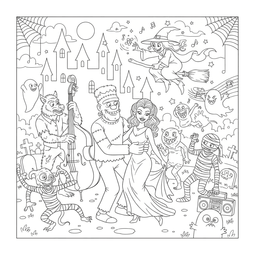 Schöne Monster Mash Dance Party Szene Färbung Seite für Kinder und Erwachsene. Kostenlos zum Herunterladen und Drucken.