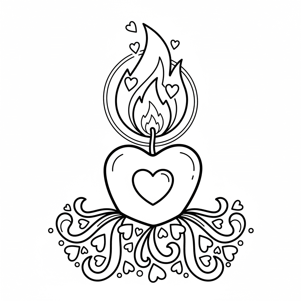 Ein entzückendes Herz Färbung Seite mit Herz Kerze romantische Glut Flamme. Perfekt für Kinder und Erwachsene, die Färbung lieben!