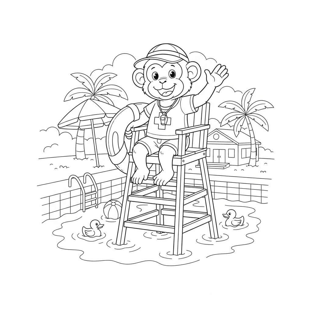Schöne Affe Rettungsschwimmer am Pool Färbung Seite für Kinder und Erwachsene. Kostenlos zum Herunterladen und Drucken.