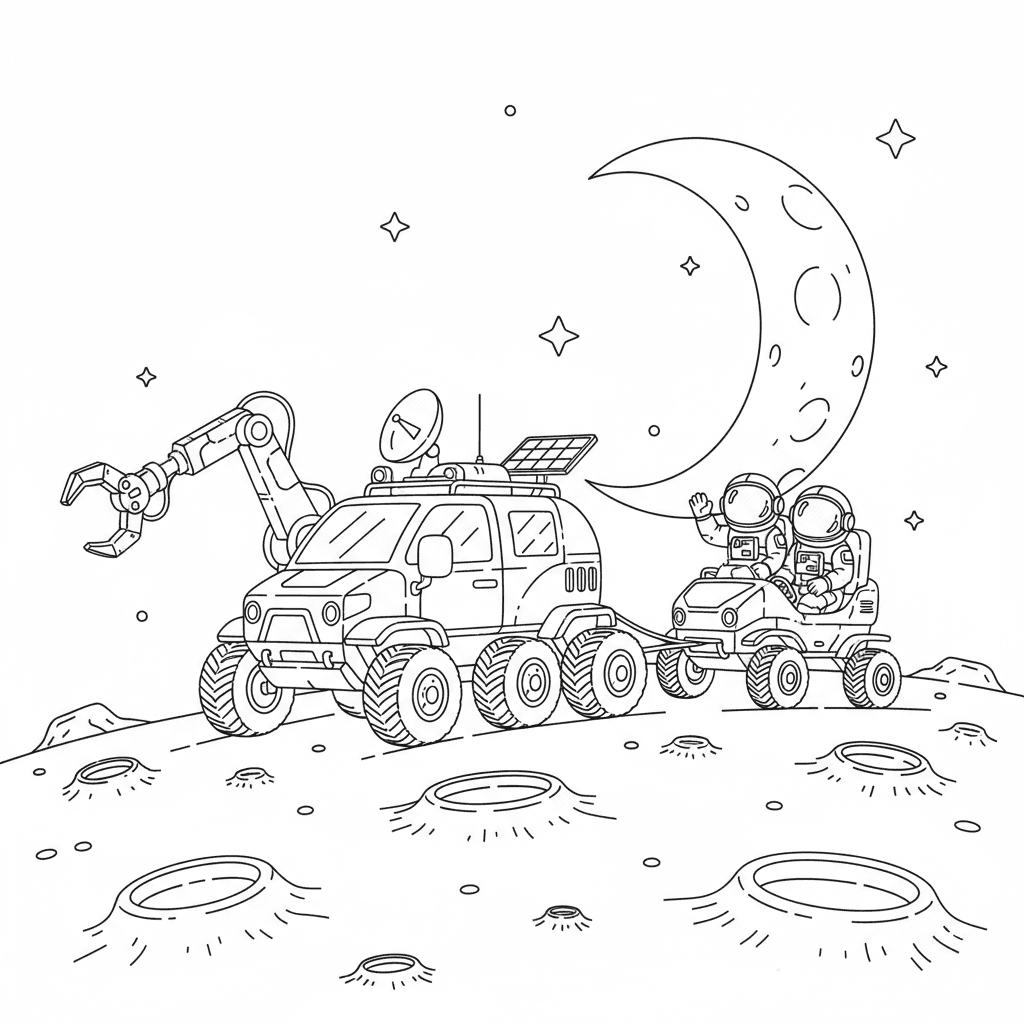 Schöne Mondforscher Rover fahren Färbung Seite für Kinder und Erwachsene. Kostenlos zum Herunterladen und Drucken.