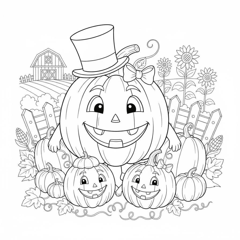 Schöne Kürbis Familie Porträt Färbung Seite für Kinder und Erwachsene. Kostenlos zum Herunterladen und Ausdrucken.