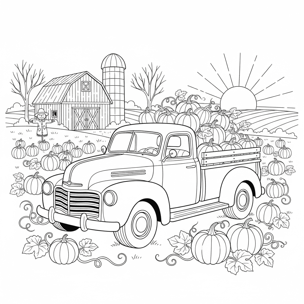 Schöne Kürbis Ernte LKW-Szene Malvorlage für Kinder und Erwachsene. Kostenlos zum Herunterladen und Drucken.