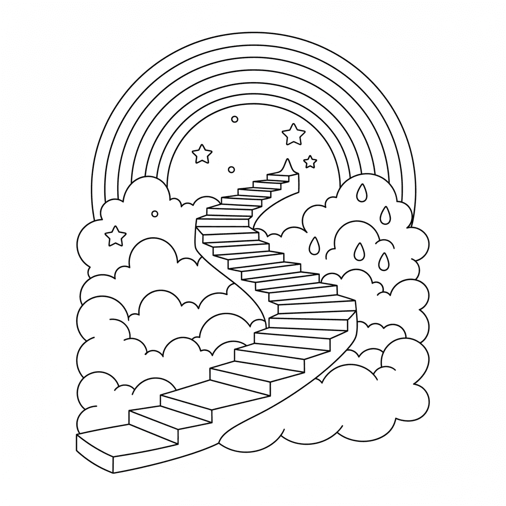 Schöne Regenbogentreppe Wolken Färbung Seite für Kinder und Erwachsene. Kostenlos zum Herunterladen und Ausdrucken.