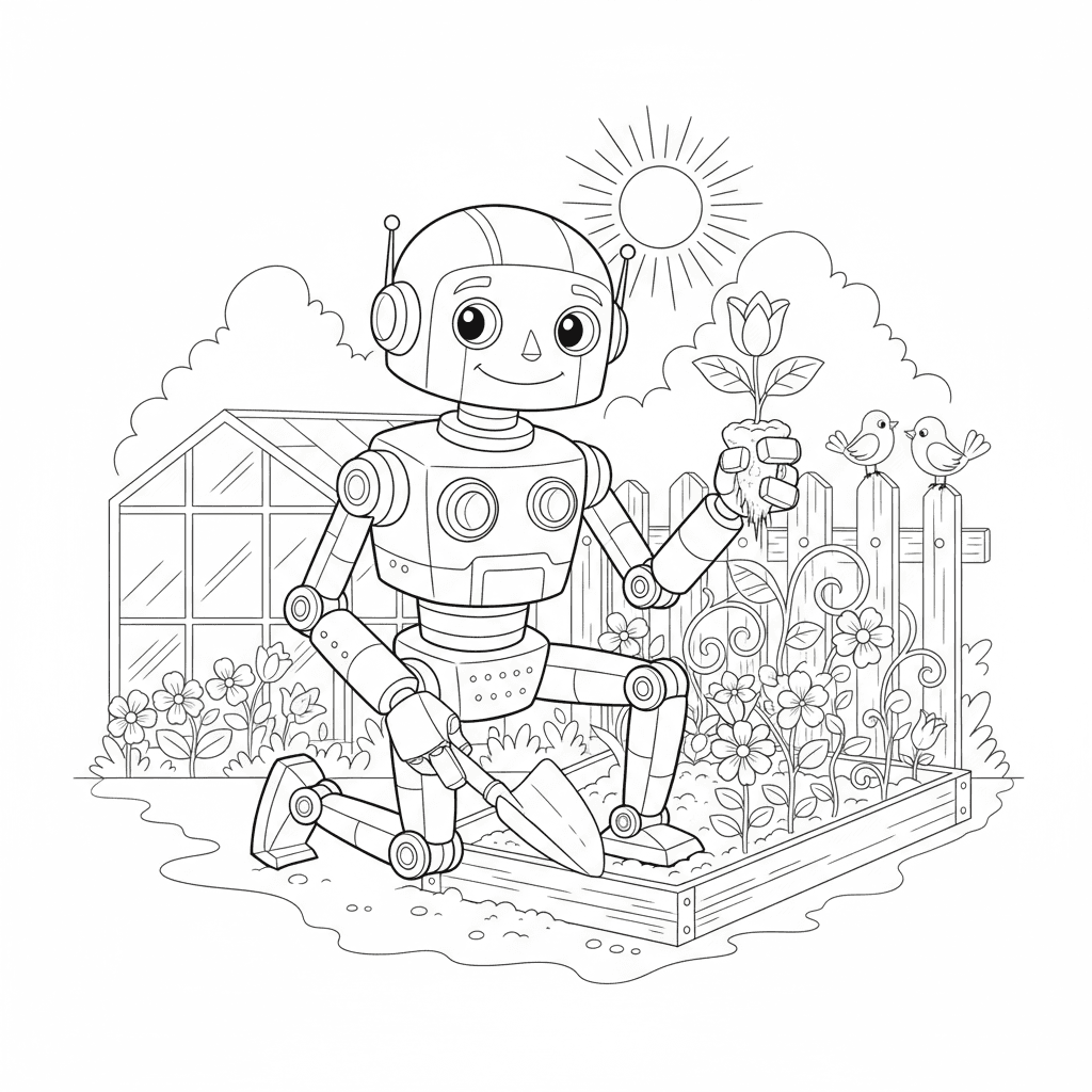 Schöne Roboter Gärtner Pflanzung Färbung Seite für Kinder und Erwachsene. Kostenlos zum Herunterladen und Drucken.