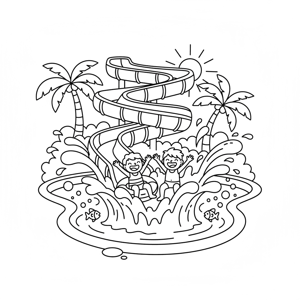Eine reizvolle Sommer Malvorlage mit Wasserrutsche spritzen Landung spannend. Perfekt für Kinder und Erwachsene, die Färbung lieben!