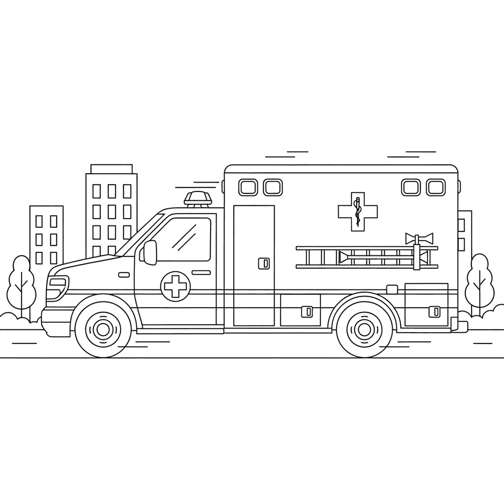 Schöne Krankenwagen Rettungswagen Malvorlage für Kinder und Erwachsene. Kostenlos zum Herunterladen und Drucken.