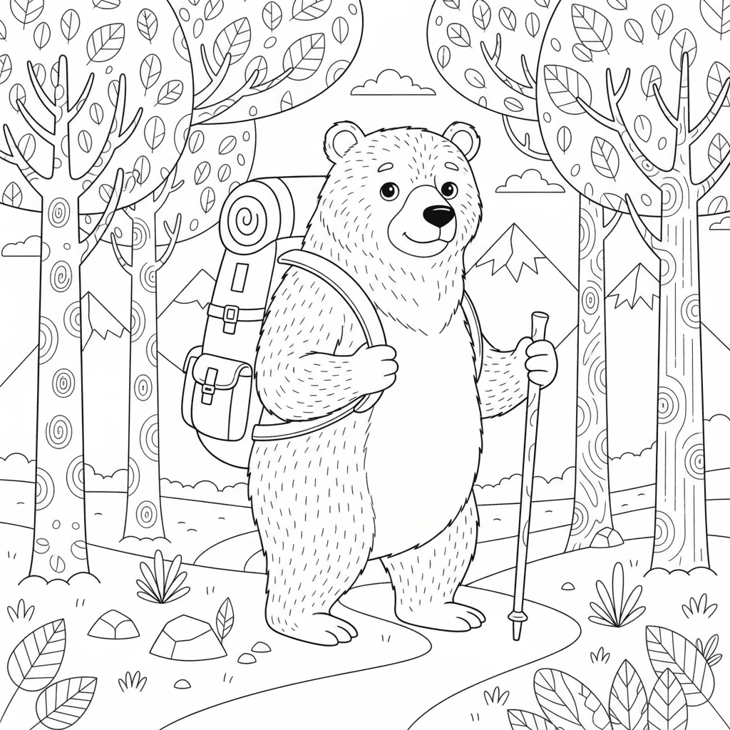 Dibujo para colorear de un oso con mochila para niños y adultos. Gratis para descargar e imprimir.