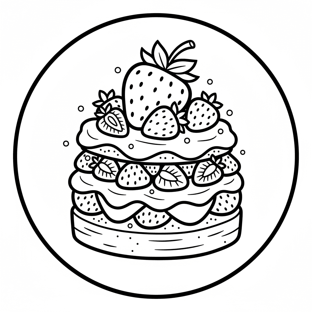 Una deliciosa página para colorear con capas de tarta de fresas y nata. Perfecto para niños y adultos a los que les encanta colorear