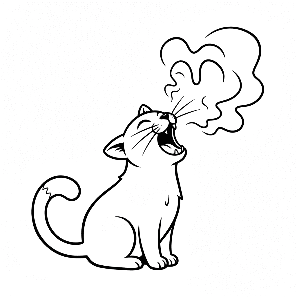Una página para colorear gato encantador con maullido de gato en voz alta expresión vocal. ¡Perfecto para niños y adultos que aman colorear!