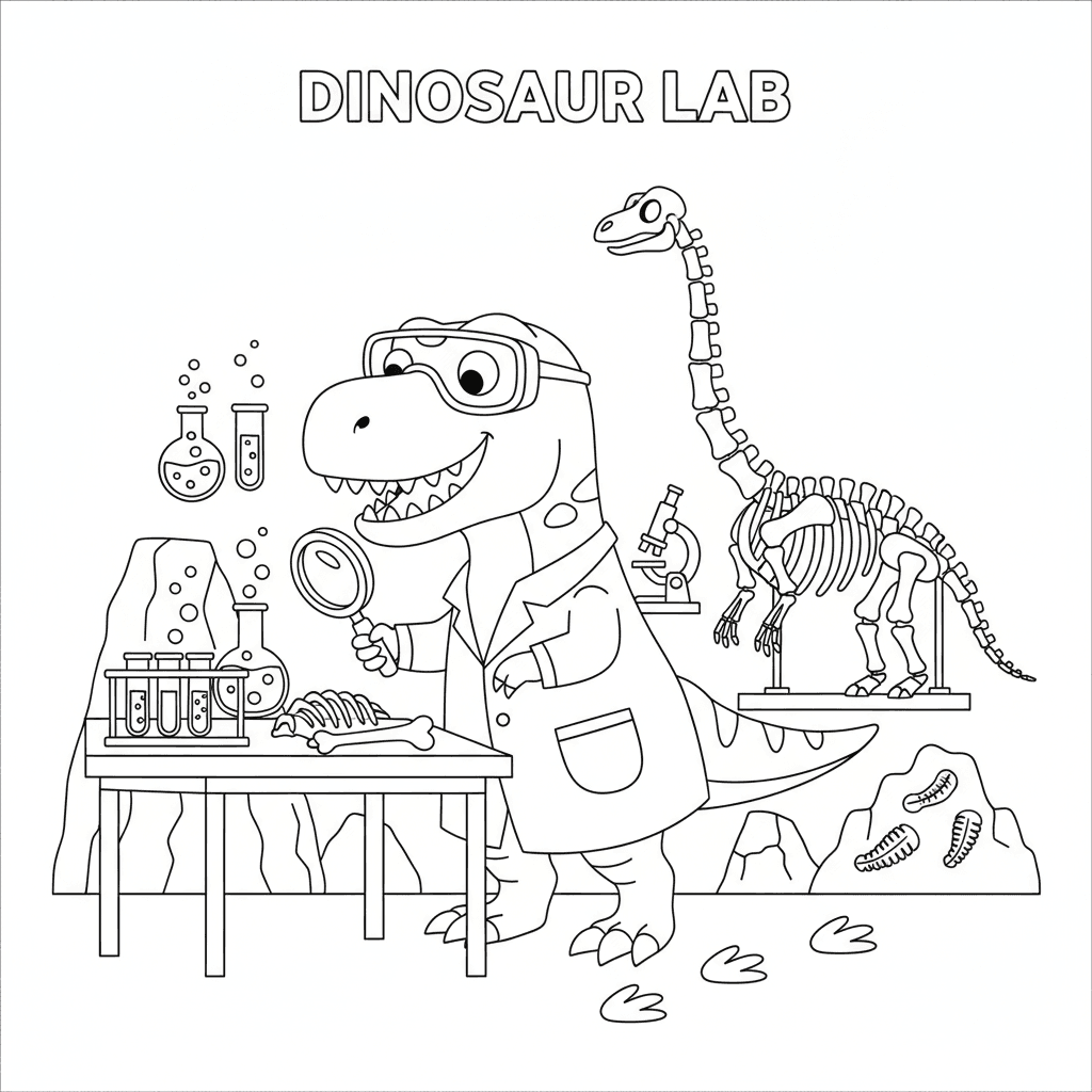 Una encantadora página para colorear de dinosaurios que muestra la investigación del laboratorio científico de dinosaurios. Perfecto para niños y adultos a los que les encanta colorear