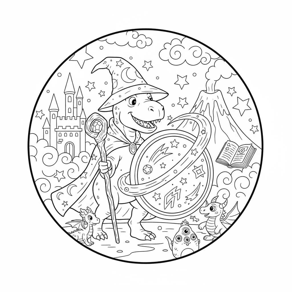 Una encantadora página para colorear de dinosaurios con hechizos mágicos de fantasía. ¡Perfecto para niños y adultos que aman colorear!