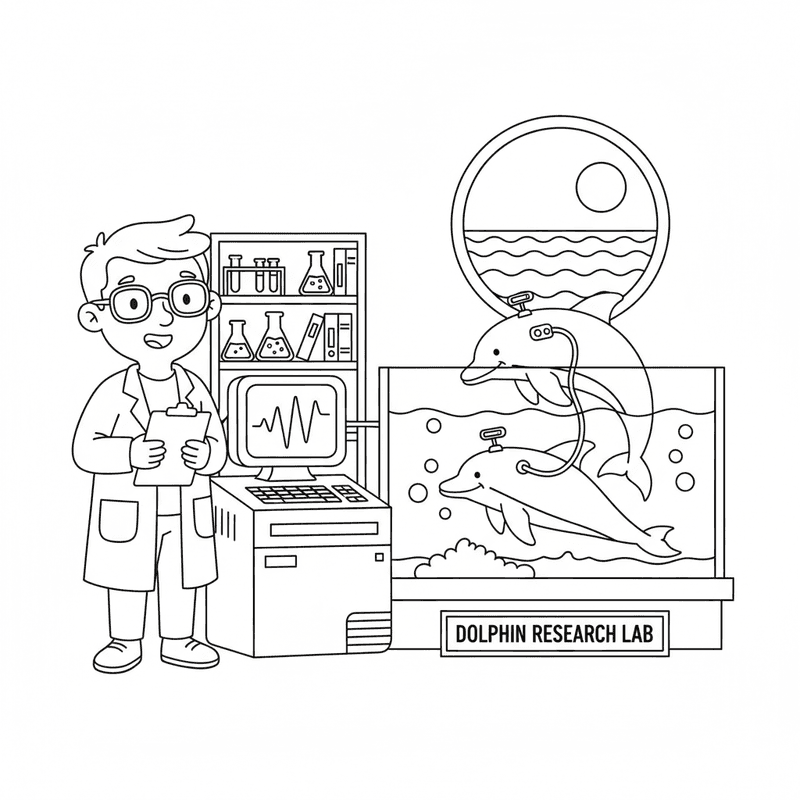 Una encantadora página para colorear de delfines con un laboratorio de investigación científica de delfines. ¡Perfecto para niños y adultos que aman colorear!