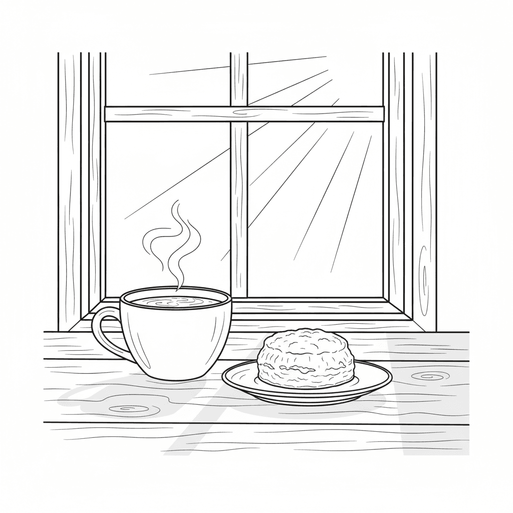 Una taza de café junto a un bollo en un plato, con la brillante luz del sol entrando por una ventana y proyectando sombras.