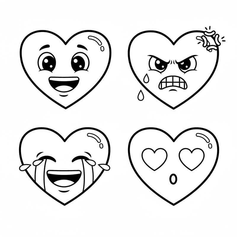 Una encantadora página para colorear de corazones con emojis de corazón y una variedad de sentimientos. ¡Perfecta para niños y adultos que aman colorear!