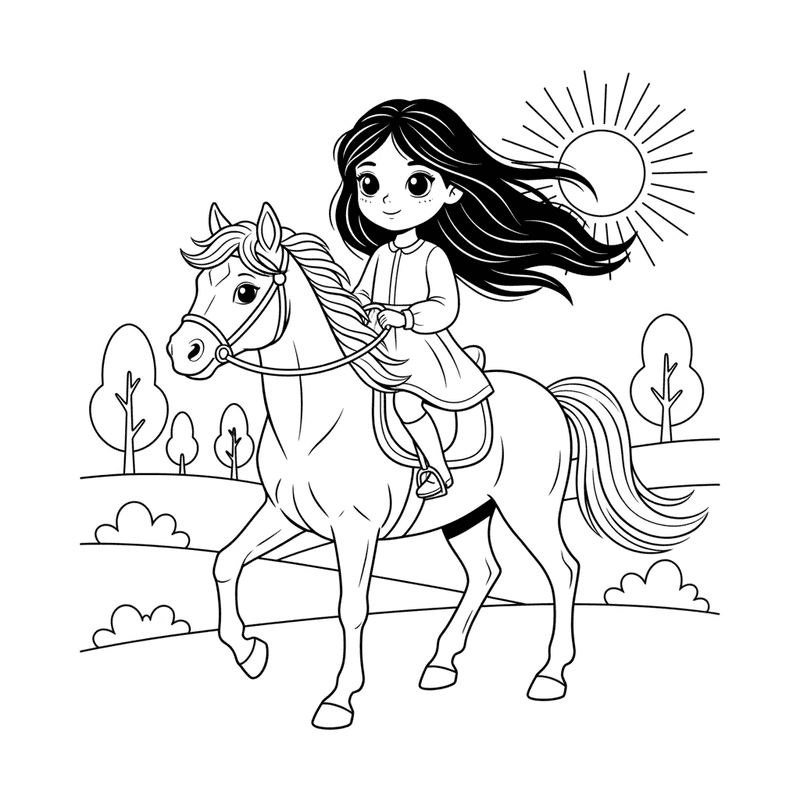 Una niña pequeña con cabello largo y negro montada a caballo. El cabello es negro, sin flequillo. La niña tiene grandes ojos marrones.