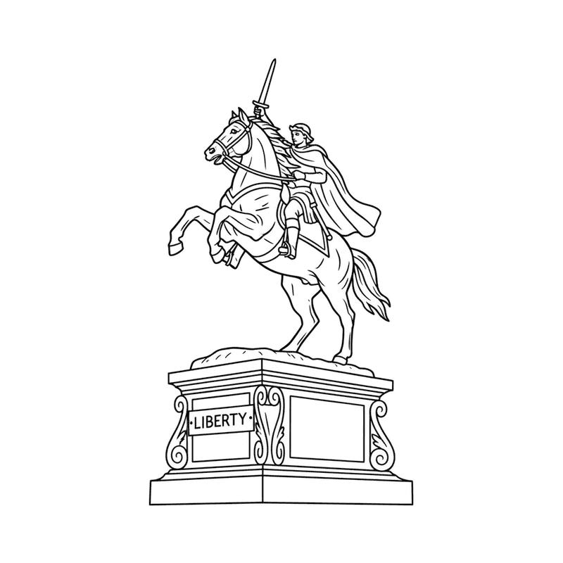Una página para colorear caballo encantador con el metal de bronce monumento estatua de caballo. Perfecto para niños y adultos a los que les encanta colorear