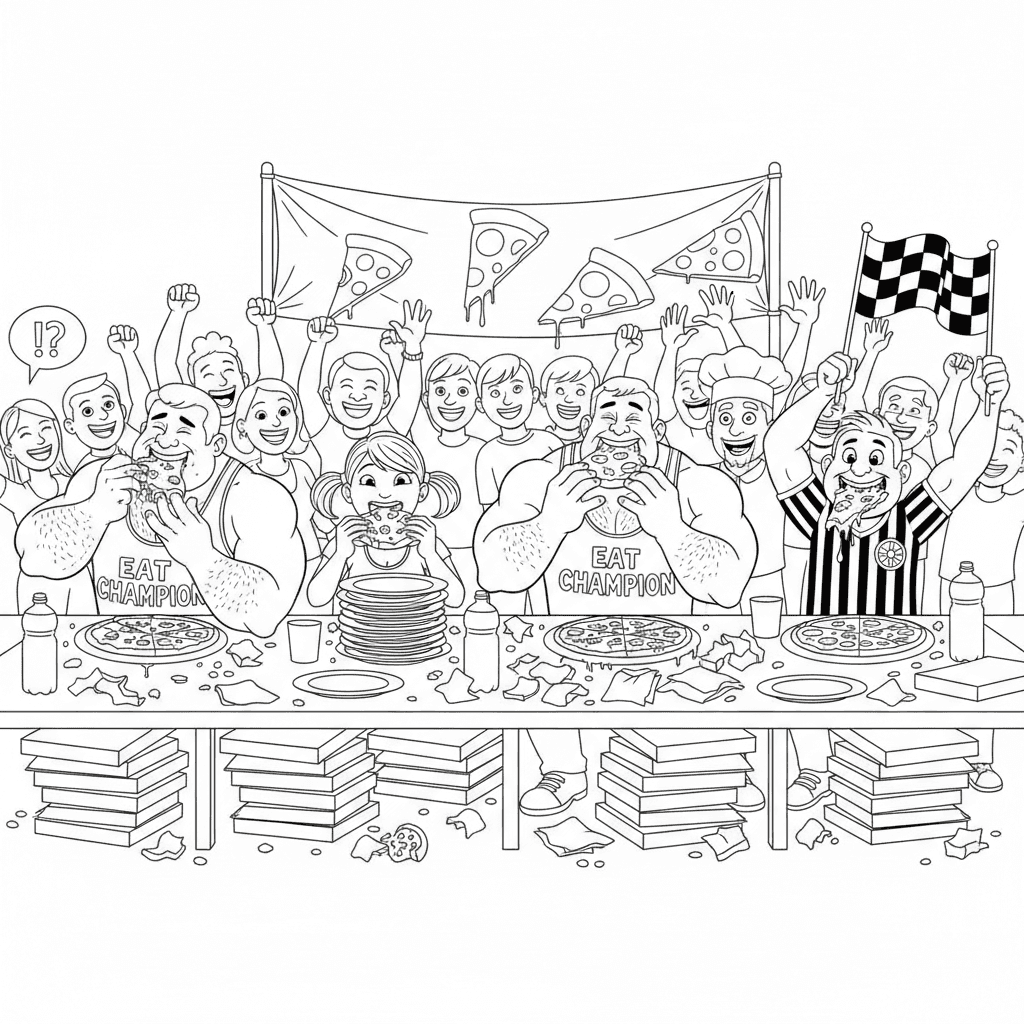 Dibujo para colorear de un concurso de comer pizza para niños y adultos. Gratis para descargar e imprimir.