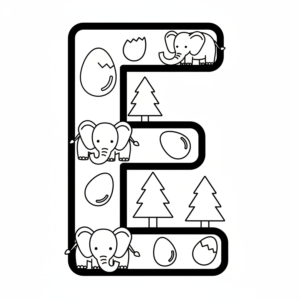 Une adorable page de coloriage de l'alphabet mettant en scène la lettre E, des œufs d'éléphants et des sapins. Idéale pour les enfants et les adultes qui aiment colorier !