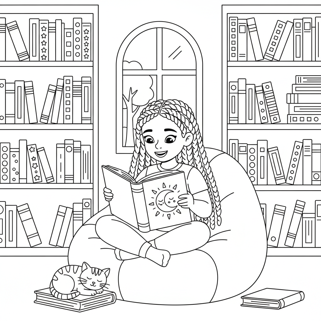 Une adorable page de coloriage représentant une jeune fille noire aux tresses africaines lisant un livre à la bibliothèque. Idéale pour les enfants et les adultes qui aiment colorier !