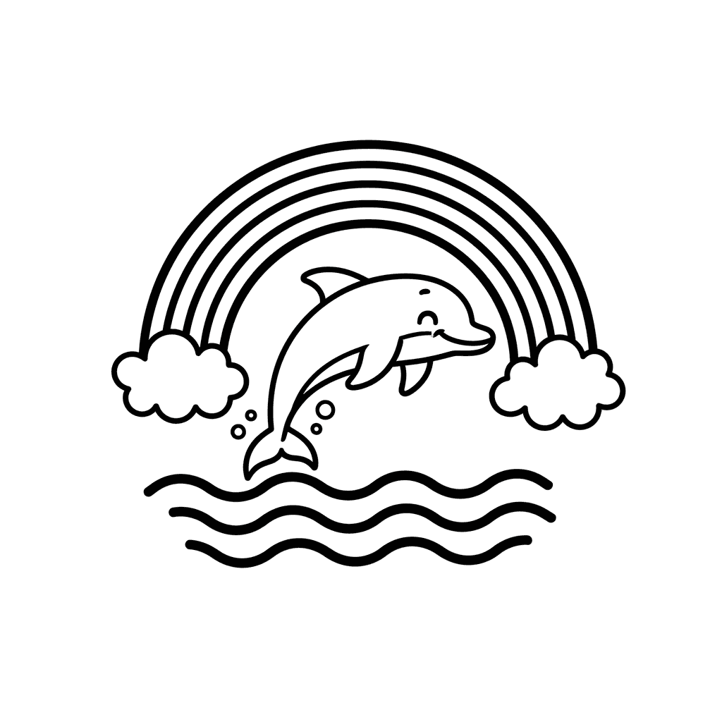 Une adorable page de coloriage représentant un dauphin sautant à travers un arc-en-ciel. Idéale pour les enfants et les adultes qui aiment colorier !