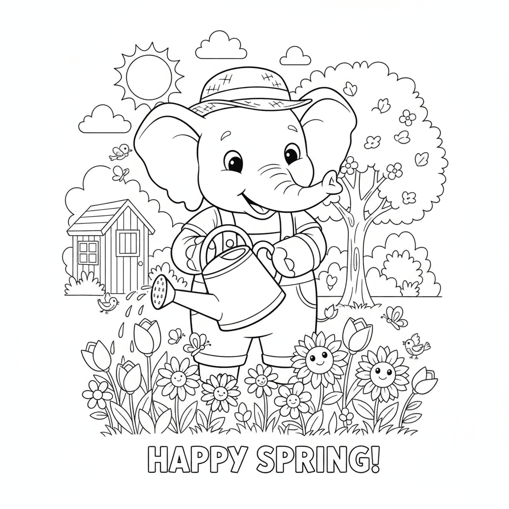 Une charmante page de coloriage d'éléphants représentant un éléphant jardinier arrosant des fleurs au printemps. Parfait pour les enfants et les adultes qui aiment colorier !