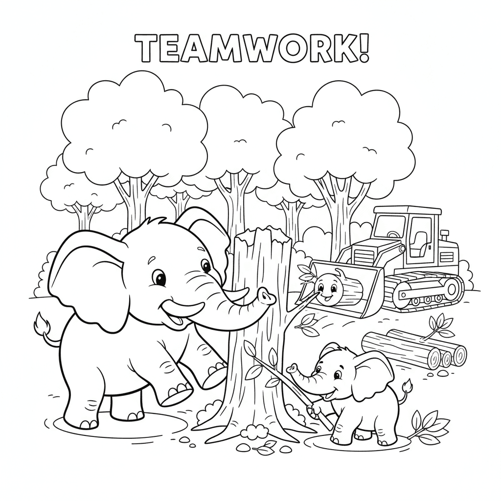 Une charmante page de coloriage d'éléphant représentant un éléphant aidant à débroussailler des arbres en train de travailler. Parfait pour les enfants et les adultes qui aiment colorier !