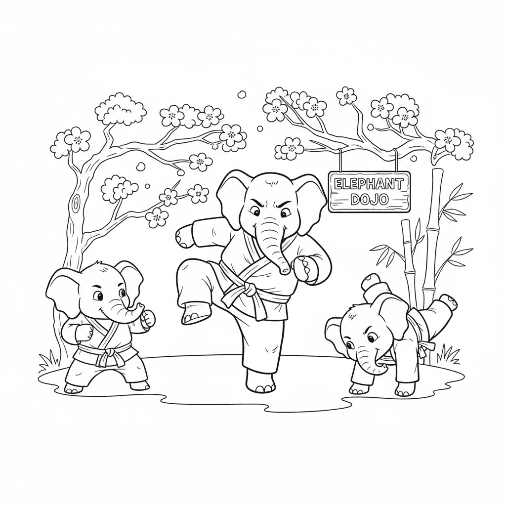 Une adorable page de coloriage d'éléphant représentant un éléphant ninja s'entraînant aux arts martiaux. Parfaite pour les enfants et les adultes qui aiment colorier !