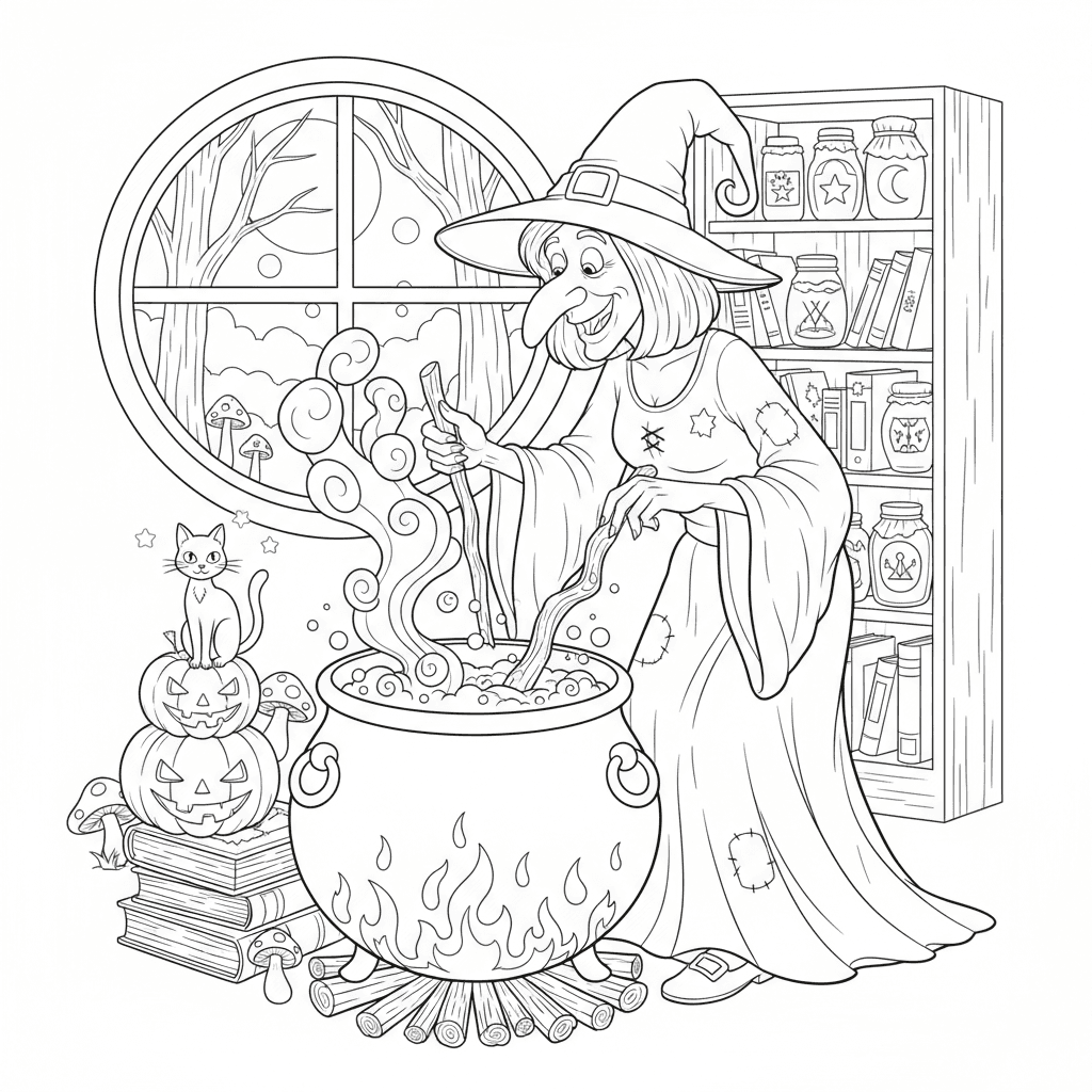Magnifique chaudron bouillonnant avec potion de sorcière, page de coloriage pour enfants et adultes. A télécharger et à imprimer gratuitement.