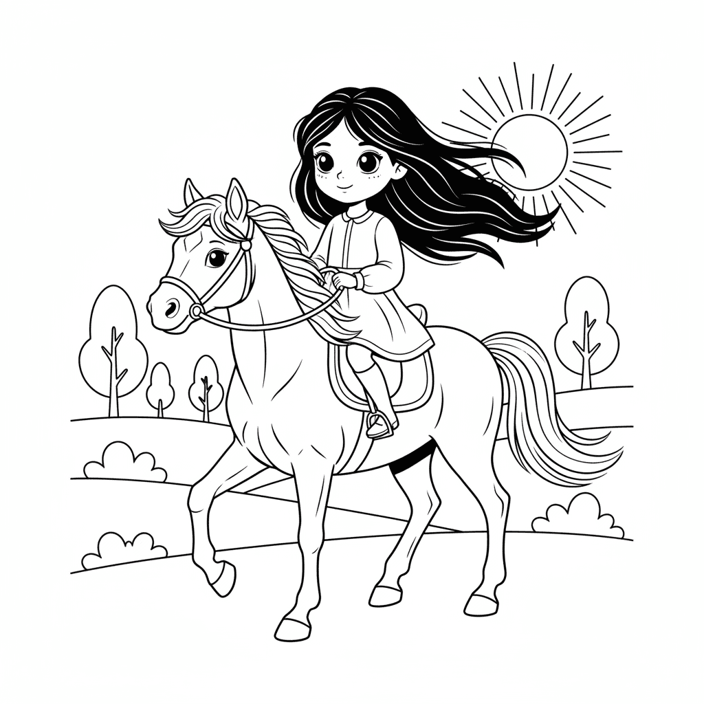 Une petite fille aux longs cheveux noirs, sans frange, à cheval. La fillette a de grands yeux bruns.