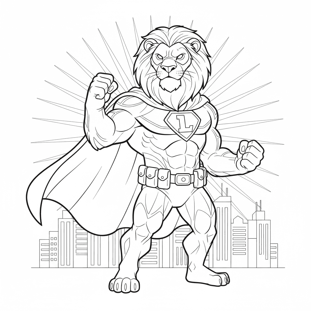 Magnifique lion avec une cape de super-héros, page de coloriage pour enfants et adultes. A télécharger et à imprimer gratuitement.