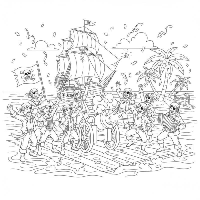 Magnifique page de coloriage sur la célébration des pirates et la mise à feu des canons pour les enfants et les adultes. A télécharger et à imprimer gratuitement.