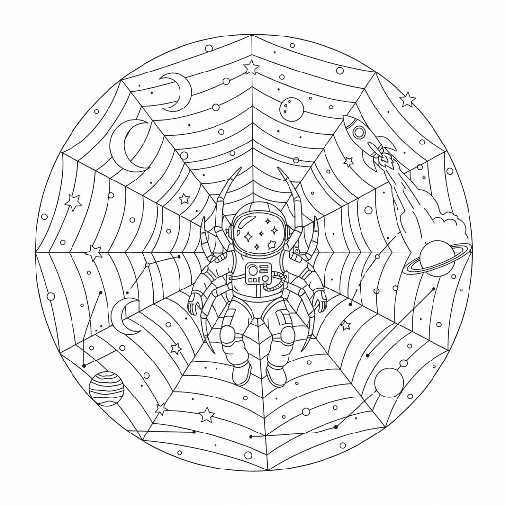 Magnifique toile d'araignée astronaute de l'espace à colorier pour les enfants et les adultes. A télécharger et à imprimer gratuitement.