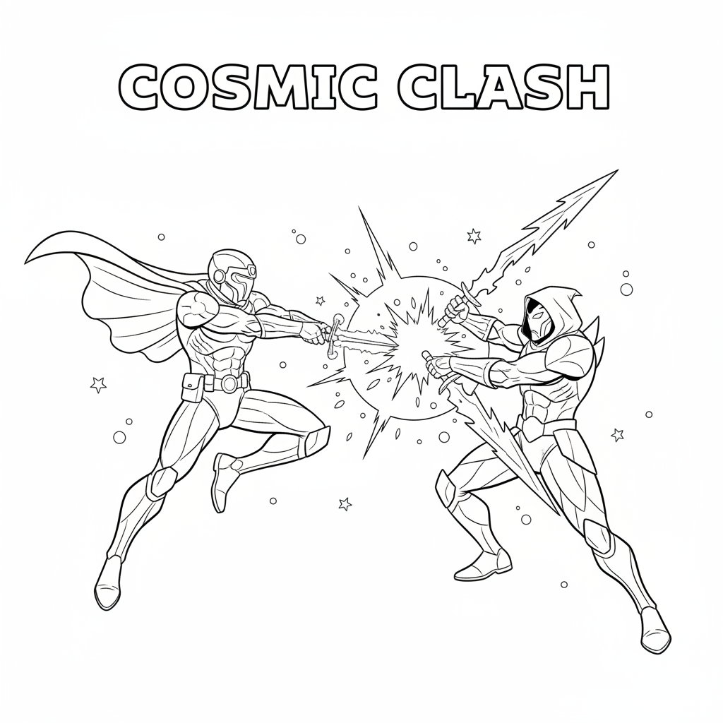 Une page de coloriage originale générée par IA, inspirée de Star Wars, mettant en scène un chevalier de l'espace et un guerrier sombre affrontant leurs épées énergétiques dans un duel spectaculaire. Il s'agit d'une œuvre non officielle, sans lien avec les créateurs originaux. Idéale pour les enfants et les adultes qui aiment colorier !