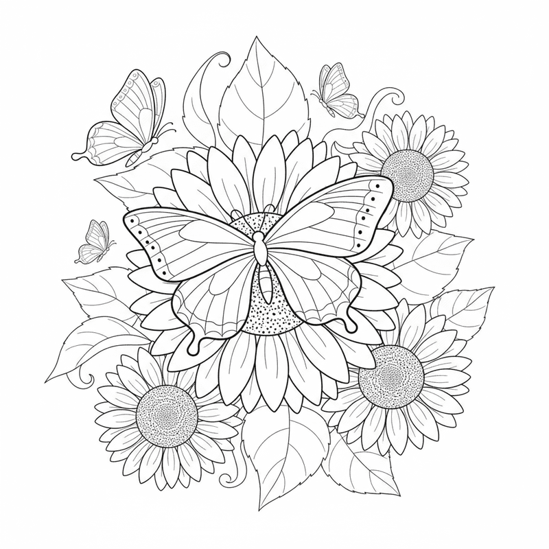 Une ravissante page de coloriage estivale représentant un papillon dans un jardin de tournesols en fleurs. Idéale pour les enfants et les adultes qui aiment colorier !