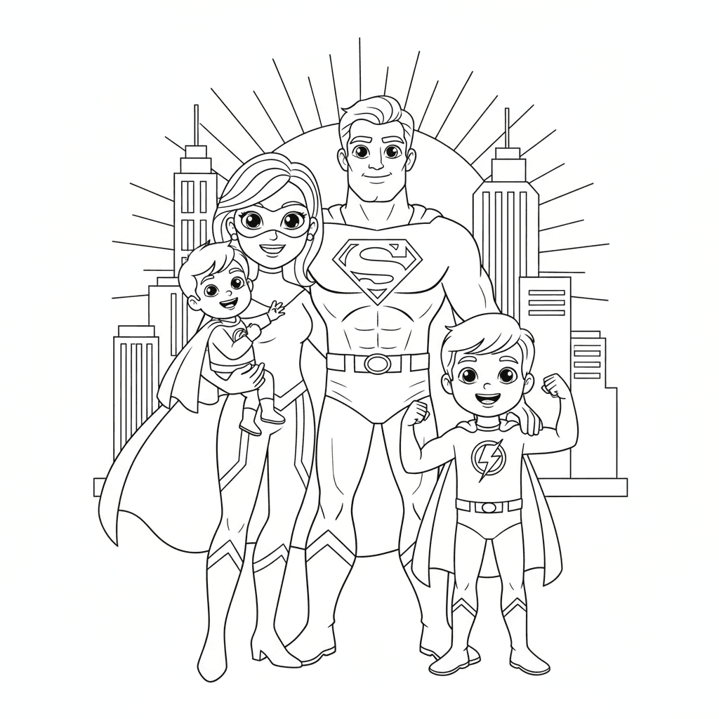 Magnifique portrait de famille de super-héros à colorier pour les enfants et les adultes. A télécharger et à imprimer gratuitement.