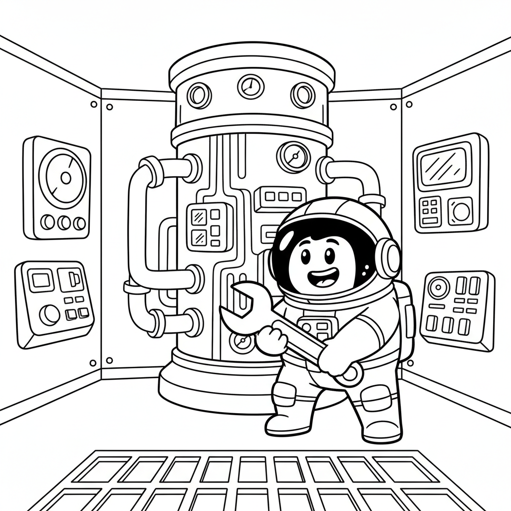 Una pagina da colorare di fan art originale generata dall'IA e ispirata a Tra di noi, con un astronauta a forma di fagiolo nella stanza del reattore che svolge un compito. Si tratta di una fan art non ufficiale, non affiliata ai creatori originali. Perfetto per bambini e adulti che amano colorare!