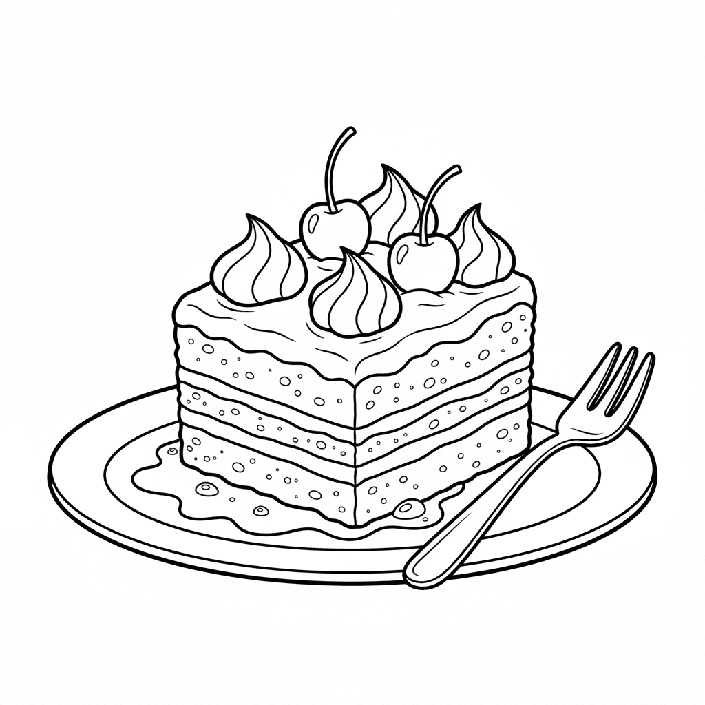 Una deliziosa pagina di torta da colorare con la torta tres leches umida e cremosa. Perfetta per bambini e adulti che amano colorare!