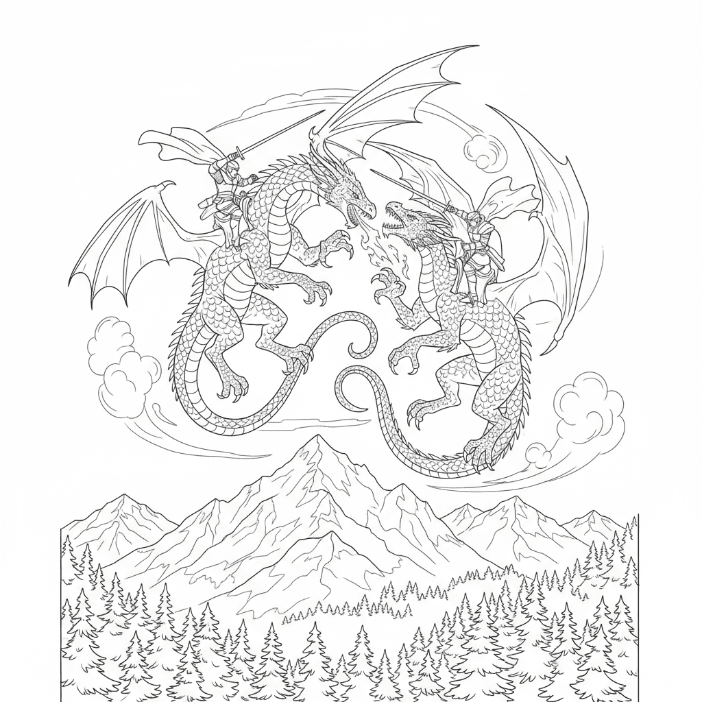 Draghi con cavalieri in lotta nei cieli. Cavalcano sopra montagne e foreste.
